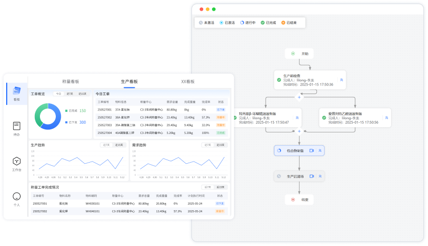 • 从计划下发到成品入库全周期管理,支持工艺路线自定义、生产进度实时监控、工单过程调度。